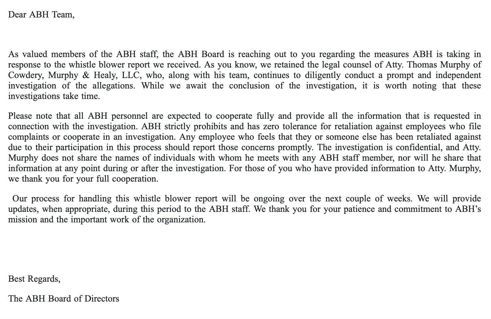 “Please note that all ABH personnel are expected to cooperate fully and provide all the information that is requested in connection with the investigation. ABH strictly prohibits and has zero tolerance for retaliation against employees who file complaints or cooperate in an investigation,” the board of directors wrote. “Our process for handling this whistleblower report will be ongoing over the next couple weeks.”