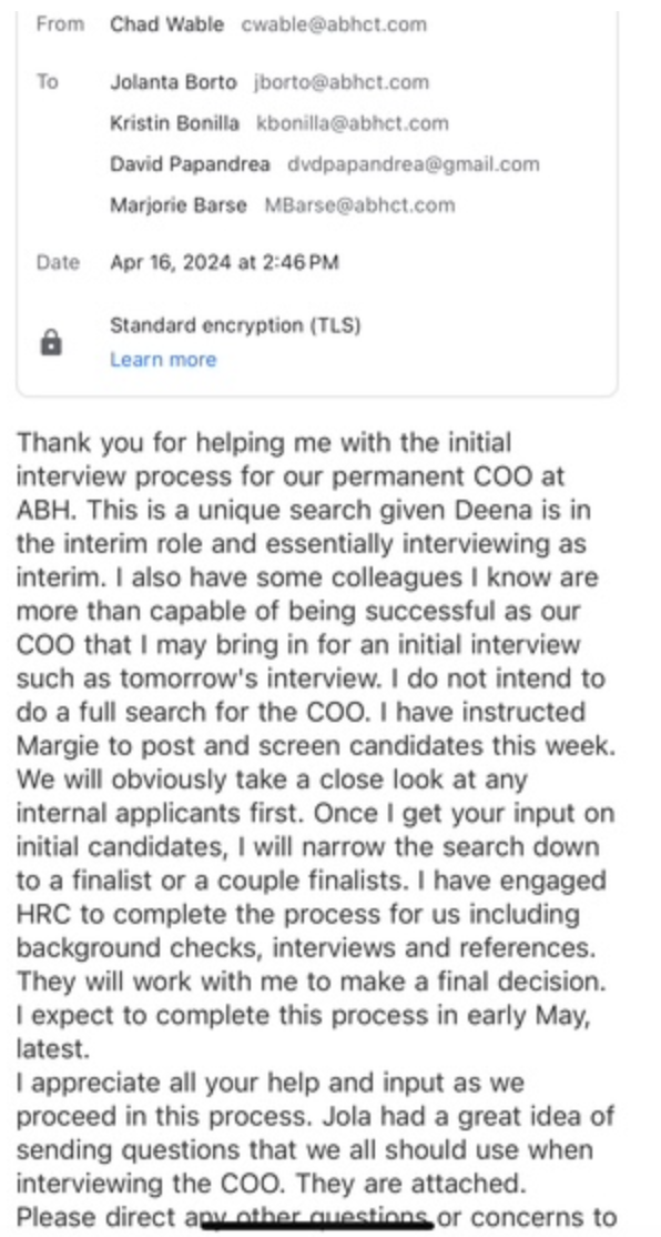 ABH had not previously had a COO, and according to an April 16, 2024, email from Wable to senior leadership, the company was not looking especially hard for one.