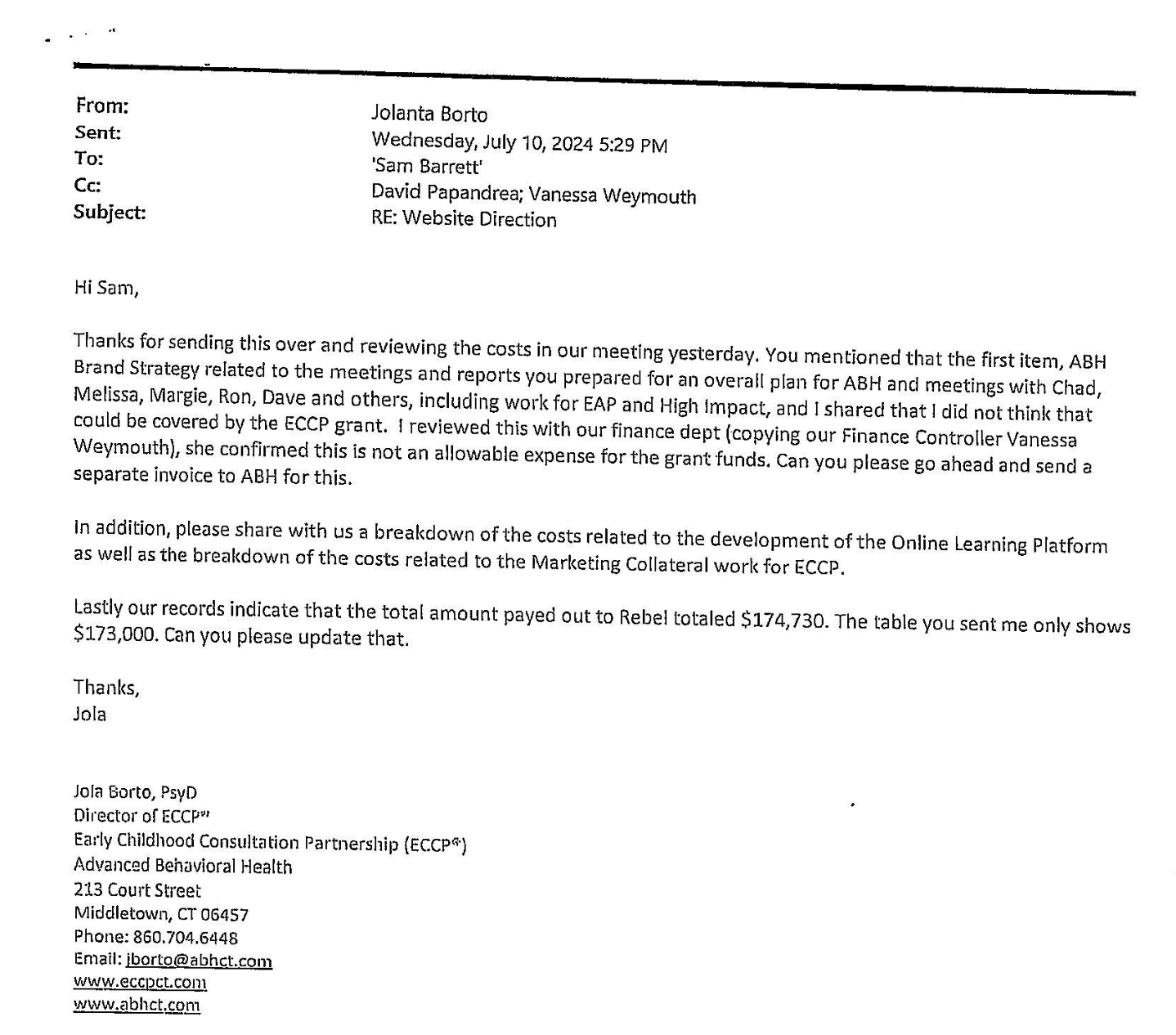 “You mention that the first item, ABH Brand Strategy related to the meetings and reports you prepared for an overall plan for ABH and meetings with Chad, Melissa, Margie, Ron, Dave and others, including work for EAP and High Impact, and I shared that I did not think that could be covered by the ECCP grant,” wrote ECCP Director Jolanta Borto in a July 2024 email to Sam Barrett of Rebel. “I reviewed this with our finance dept. (copying our Finance Controller Vanessa Weymouth), she confirmed that this is not an allowable expense for the grant funds.”