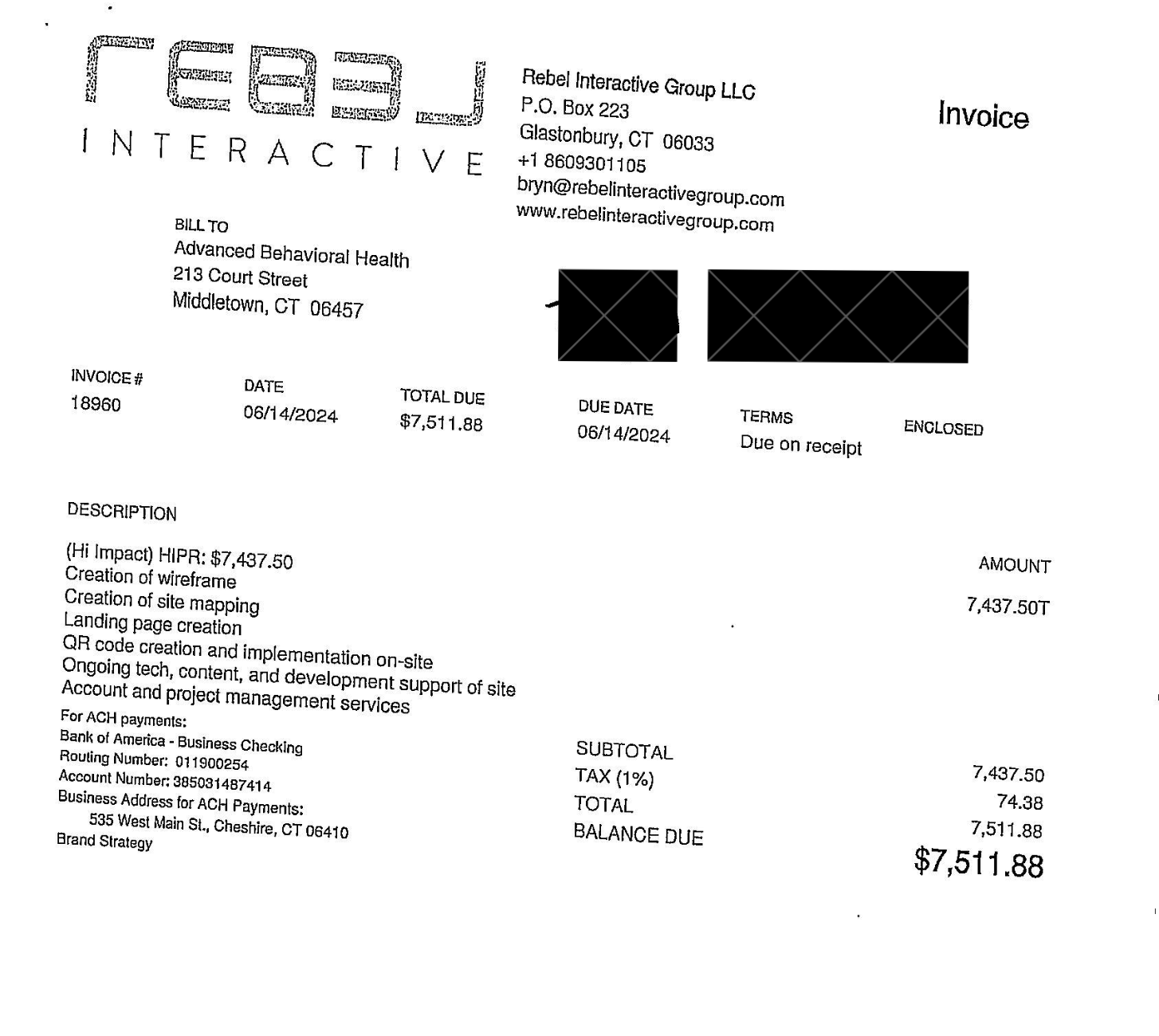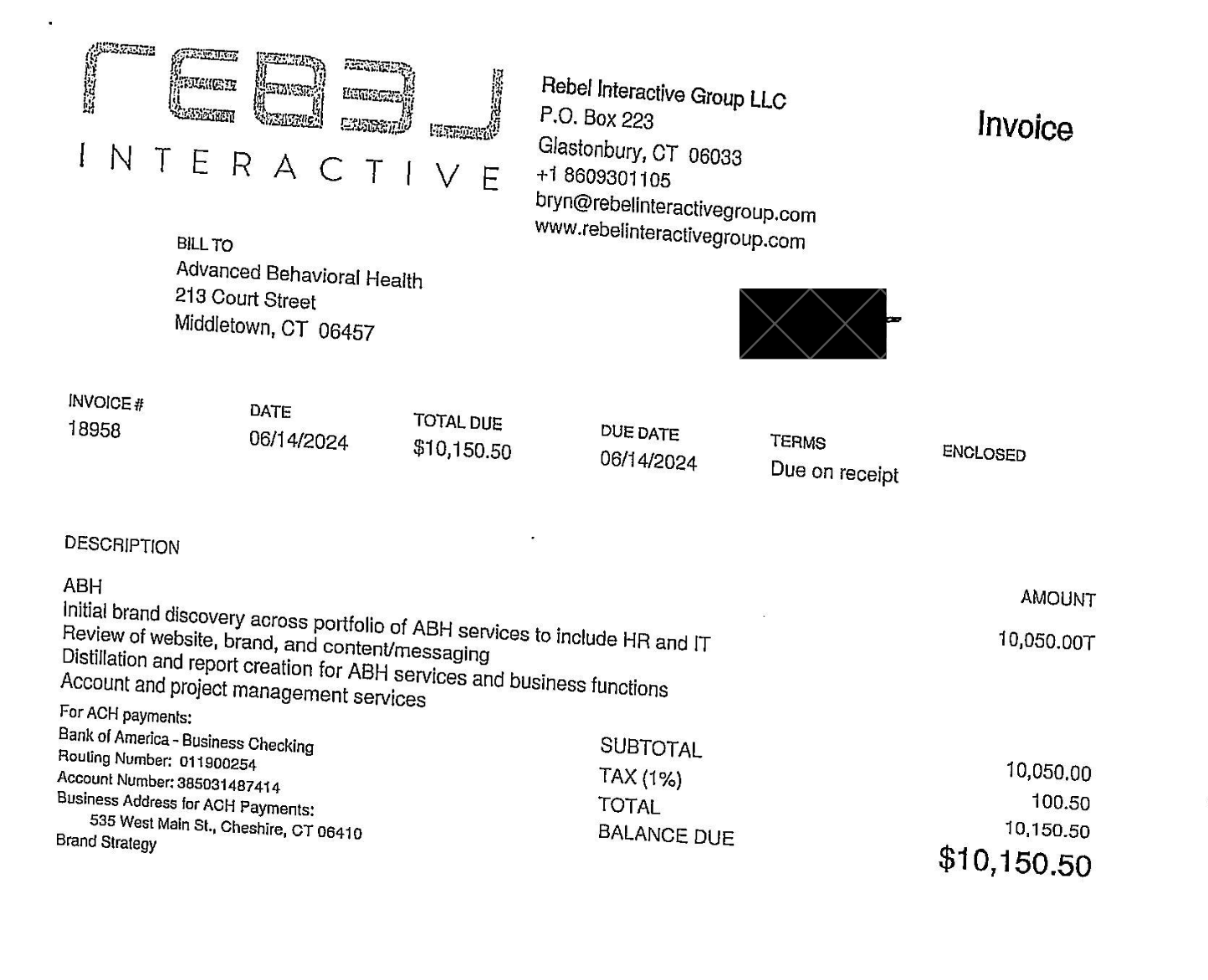 Another invoice sent by Rebel to ABH for work done on behalf of High Impact was labeled “brand strategy,” and amounted to more than $7,500 for the creation of a landing page and ongoing tech support for High Impact, among other items. Another invoice for more than $1,000 for “brand repositioning strategy,” was submitted by Rebel for work done for Solutions EAP, ABH’s other for-profit subsidiary.