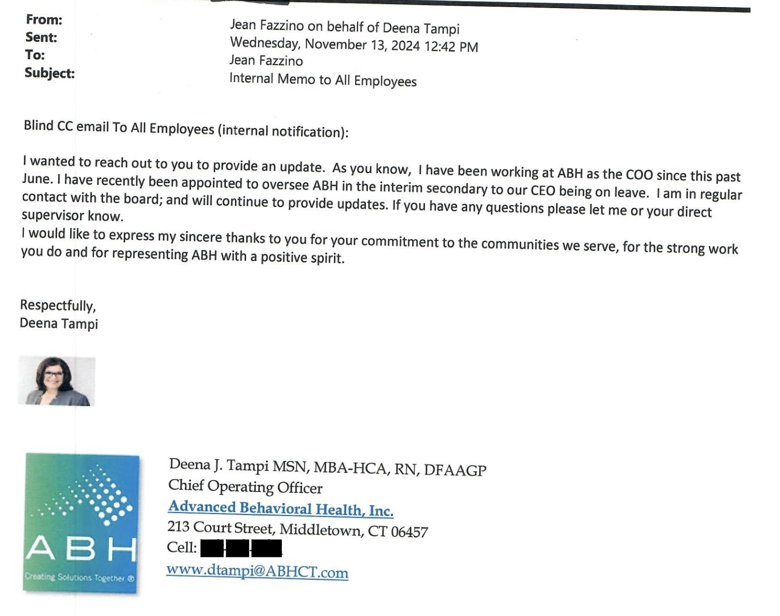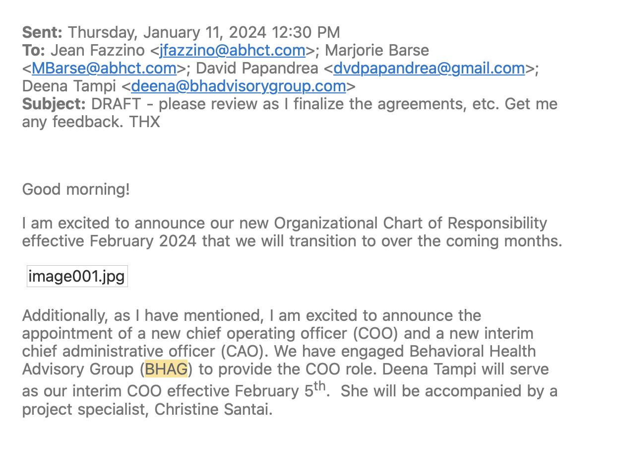 Deena Tampi was officially hired as COO in June, but she had actually been working for ABH longer than that. Her company, Behavioral Health Advisory Group (BHAG), was quickly brought into the fold by Wable after he was hired as CEO in September of 2023. In January of 2024, ABH contracted with Tampi’s company “to provide the COO role,” according to an email.